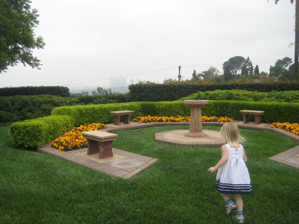 The grounds are just beautiful. There are lush green nooks for meditation or reflection, and great views of odd vistas, of little seen parts of Los Angeles and unfamiliar angles on downtown. Briar met a spookily-calm man, bone-thin with a broad hat, who dubbed her an angel. When she hid her face, he amended that to shy angel, saying “I shan’t force an introduction then.”